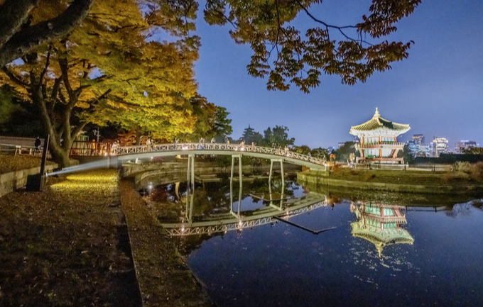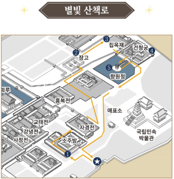 궁중요리를 먹은 후엔 해설사와 함께 경복궁 야간 관광을 할 수 있는데, 자경전을 시작으로 하여 집옥재, 장고, 팔우정, 건청궁을 지나 향원정으로 이어지는 경복궁 북부의 야경을 감상할 수 있습니다. 건청궁과 향원정에서는 고종의 이야기를 담은 연극도 관람할 수 있어 독특한 행사를 체험할 수 있습니다. 별빛야행의 백미인 맛교를 건너며 향원정의 야경을 느껴볼 수 있습니다.