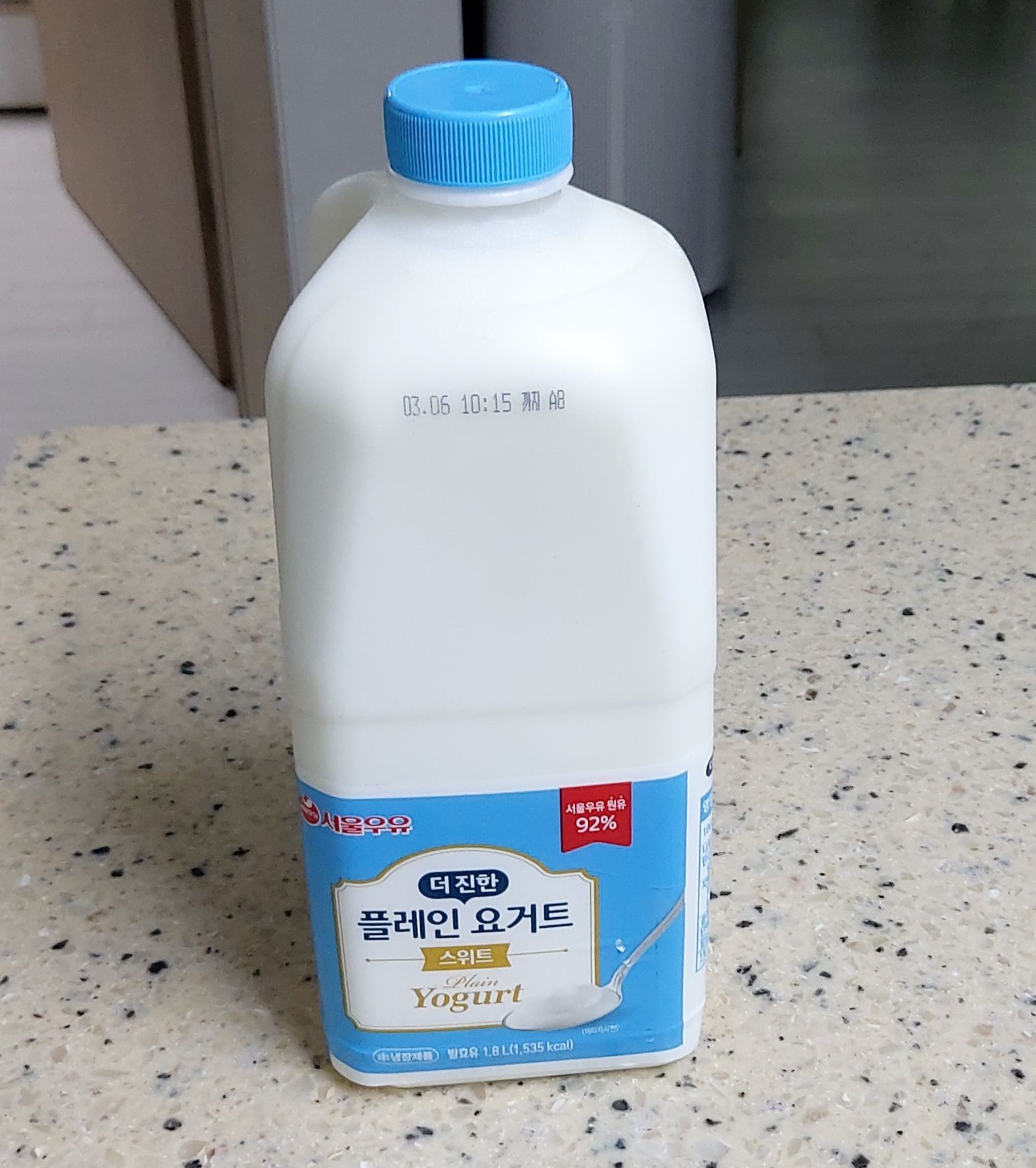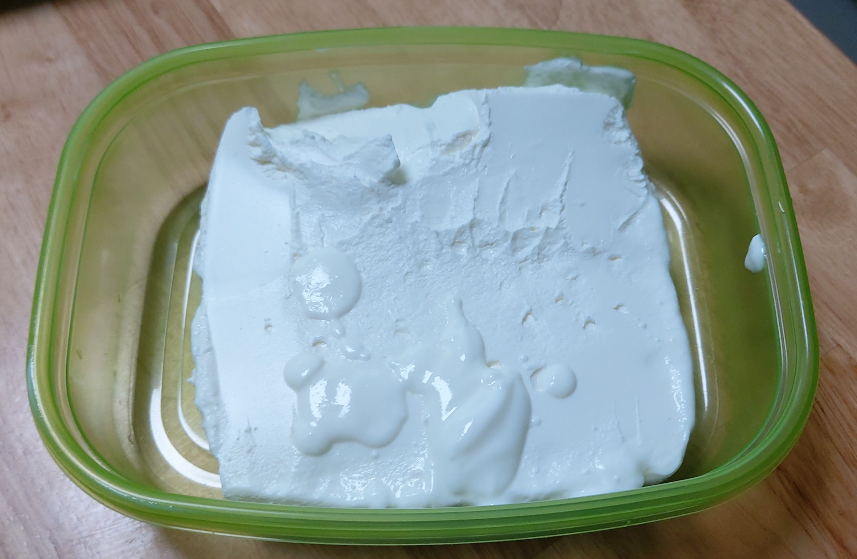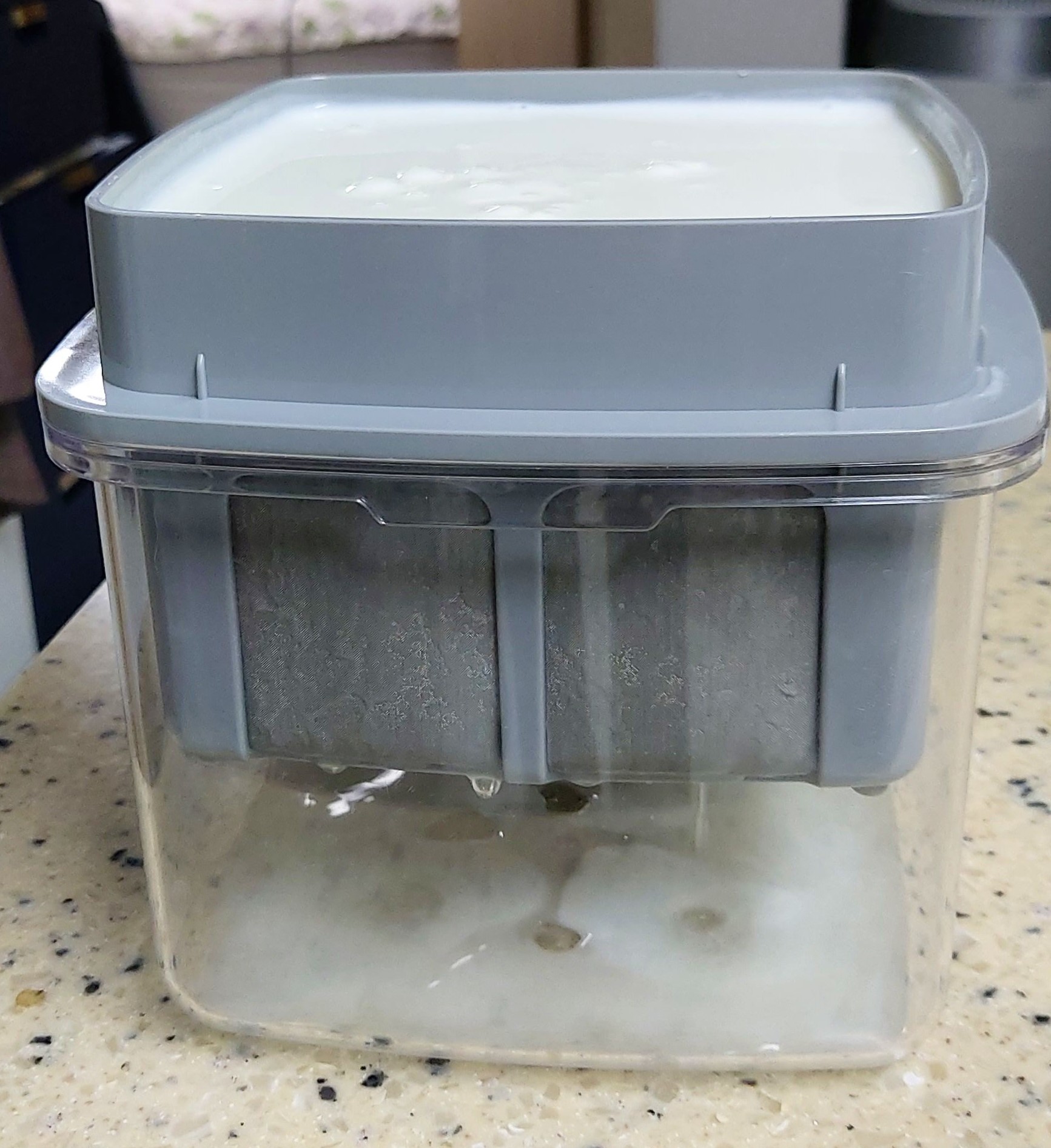 플레인 요거트를 요거트 메이커에 부어놓고 24시간 동안 냉장고에 넣어놓습니다. 날짜와 시간을 적어서 넣어두면 시간 맞추기 편리합니다. 붓자마자 유청이 분리되기 시작합니다.