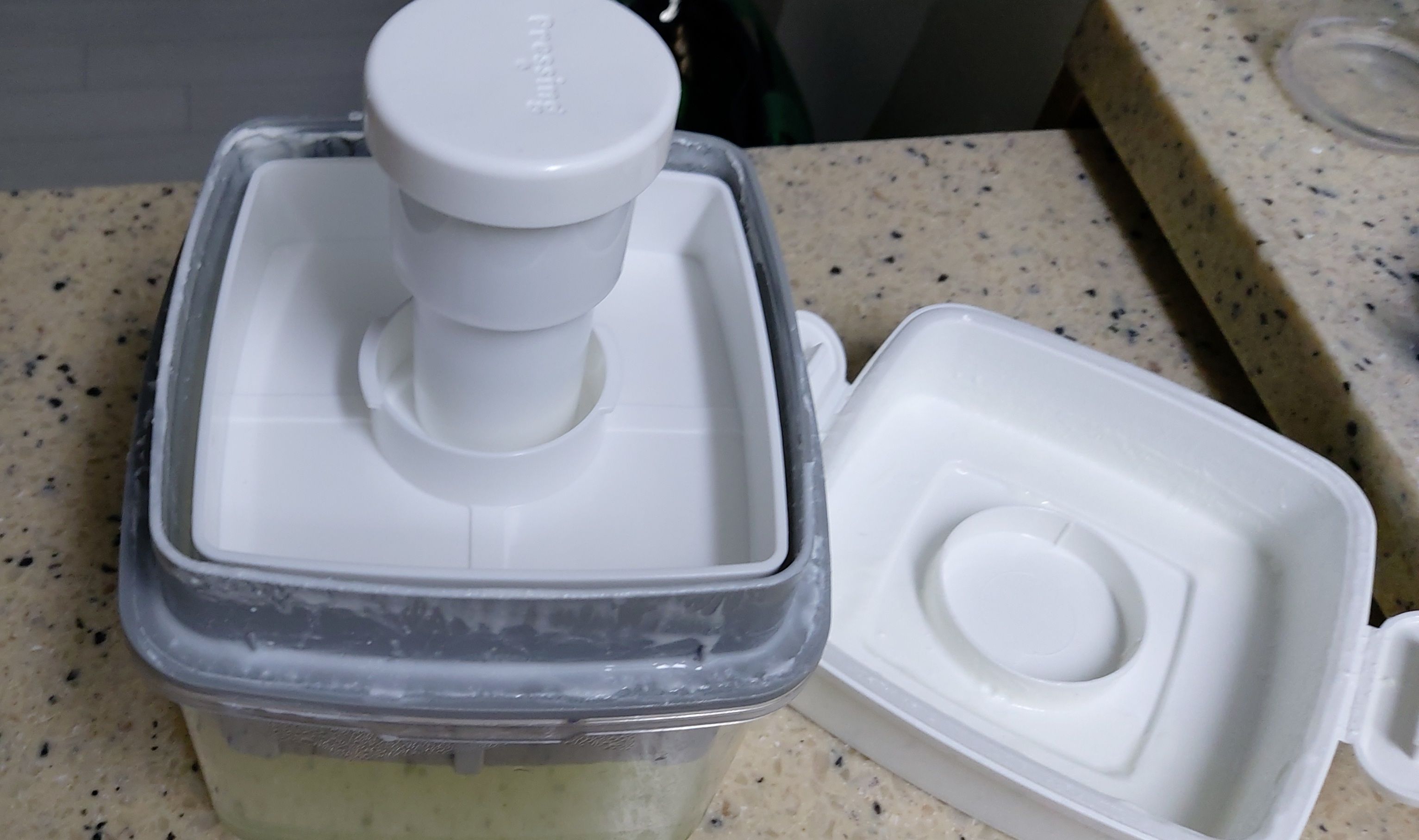 누름봉을 설치하면 약간 꾸덕해진 요거트가 더욱더 단단하게 꾸덕해집니다. 이 상태로 12시간을 냉장고에 넣어둡니다.