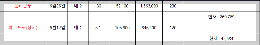 에코프로와 실리콘투가 지금 마이너스를 기록하고 있지만 에코프로(2차 전지관련주)는 추가매수를 하여 계속 늘려갈 생각이고, 실리콘투(화장품유통업체)는 관련뉴스를 좀 더 찾아보고 계속 가지고 갈지 , 주중에 팔지 결정을 하기로 했다. 실리콘투는 몇 달 전에 샀어야 했는데, 너무 높아진 가격에 사서 그런지 이득을 못 보고 있는 것 같다.