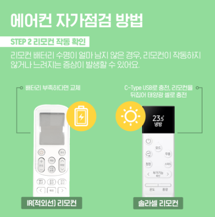 리모컨 배터리 수명이 다 되었거나 방전되었을 경우에도 에어컨이 작동하지 않습니다. IR(적외선) 리모컨은 건전지를 새것으로 교체만 하면 되고, 솔라셀 리모컨은 C타입 충전기로 충전을 하거나, 태양광 충전을 하여 사용합니다.