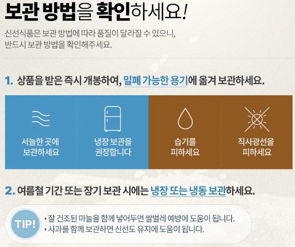 쌀도 신선식품이기 때문에 상온에서 약 15일이 지나면 신선도가 떨어지기 시작합니다. 쌀눈과 미강이 살아있는 나노미제품을 신선하게 드시려면 냉장보관이 가장 좋습니다. 냉장보관하지 못할 경우 직사광선을 피하고 서늘하고 습기가 없는 곳에 보관해야 합니다. 하절기 및 장기 보관 시에는 반드시 냉장보관 하는 것이 좋습니다.