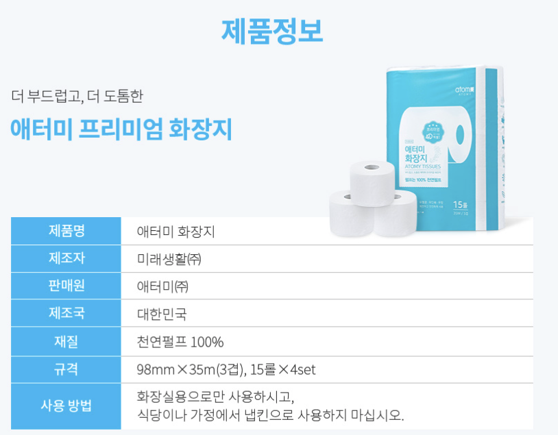 애터미 화장지를 사용한 지 몇 년 되었습니다. 중간에 다른 화장지를 써보기도 하였는데 다시 애터미 화장지를 찾게 되었답니다. 시댁에서도 친정에서도 이 제품만 사다 달라고 저에게 항상 부탁을 하십니다. 집들이 선물용으로도 너무 좋아 휴지를 사용해 본 지인들이 어디 제품이냐고 물어보며 사는 방법을 물어보기도 합니다.