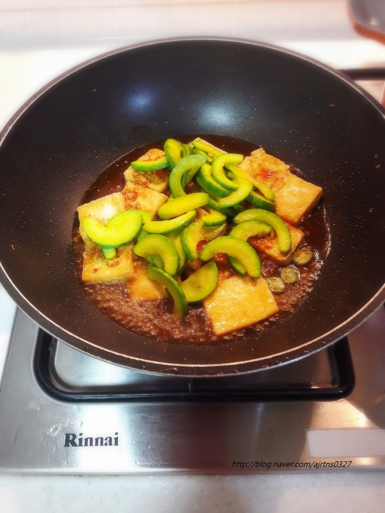 붓고 볶아놓은 애호박과 파, 청양고추 약간