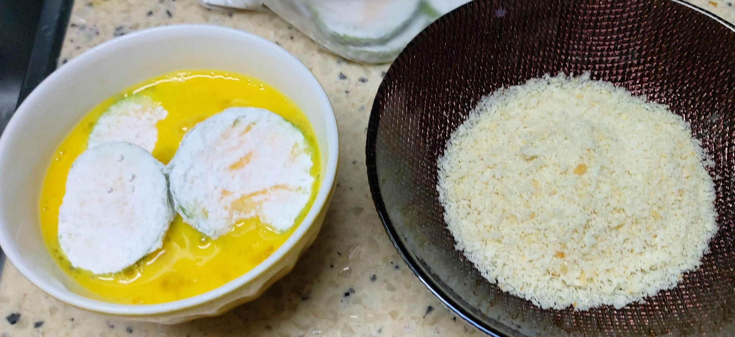 3. 달걀물에 전분 묻은 호박을 적시고 튀김가루를 묻혀주세요