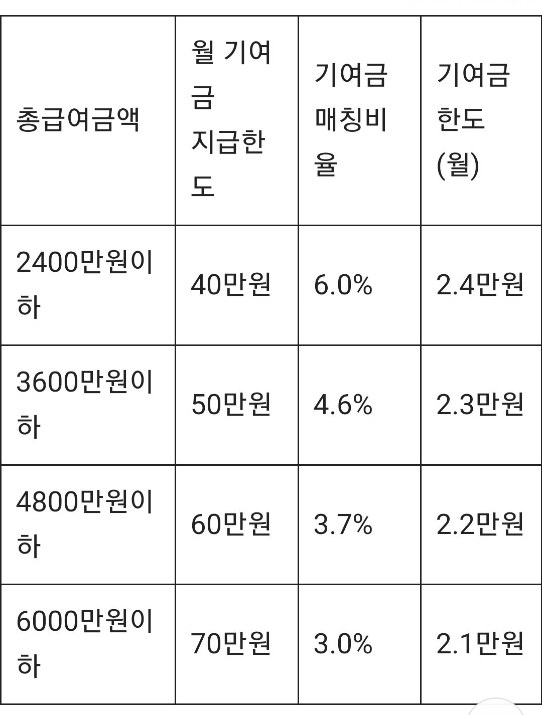 월기여금지급한도는 각 소득구간의 월납입액의 각 최대 금액에 대해 일정비율을 적용하겠다는 뜻입니다. 여기서 일정비율에 해당되는 말이 매칭비율입니다. 예를 들면, 총급여액이 2400만 원 이하인 사람은 월 납입액 최대 40만 원까지 그것의 6%를 나라에서 추가로 지원해 준다는 말입니다. 즉, 최대 매달 24,000원을 지원받게 됩니다.