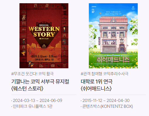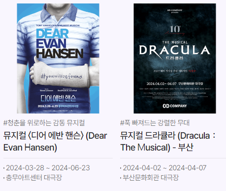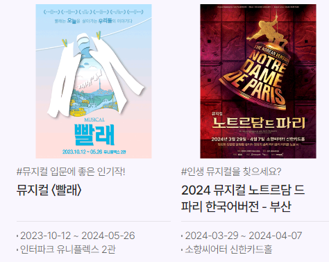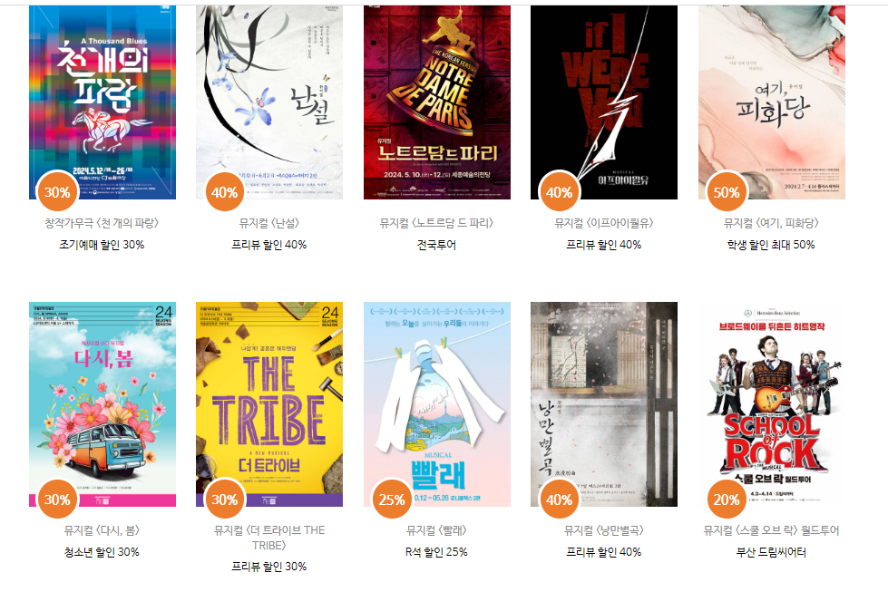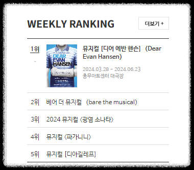 예스 24에서 느 1위부터 인기 있는 뮤지컬이 랭크되어 어떤 작품을 예매할지 도움이 될 것 같습니다. 청년들의 문화예술 활동 접근성을 높이는 공연들을 관람하고 다양한 문화혜택들을 받으시기 바랍니다.