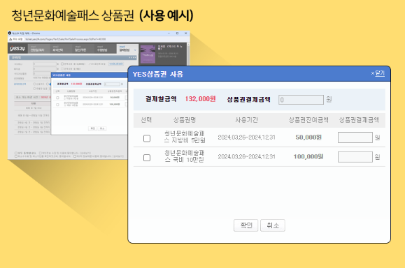 ◆ 청년문화예술패스 발급 신청이 완료되면 마이페이지> 계좌내역> YES상품권 메뉴에서 청년문화예술패스 지원금액을 확인할 수 있습니다. 청년문화예술패스 이용권을 사용할 수 있는 공연이 있고 미적용되는 공연이 있으니 확인하시고 예매하시면 되겠습니다.