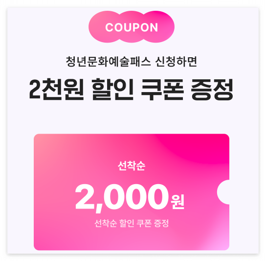 ◆ 청년문화예술패스를 신청하면 2천 원 할인 쿠폰을 증정합니다