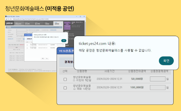 ◆ 예스 24에서 청년문화예술패스를 신청하면 예매수수료 면제쿠폰 2매와 연극 뮤지컬 할인쿠폰(3천 원, 5천 원 각 1매)을