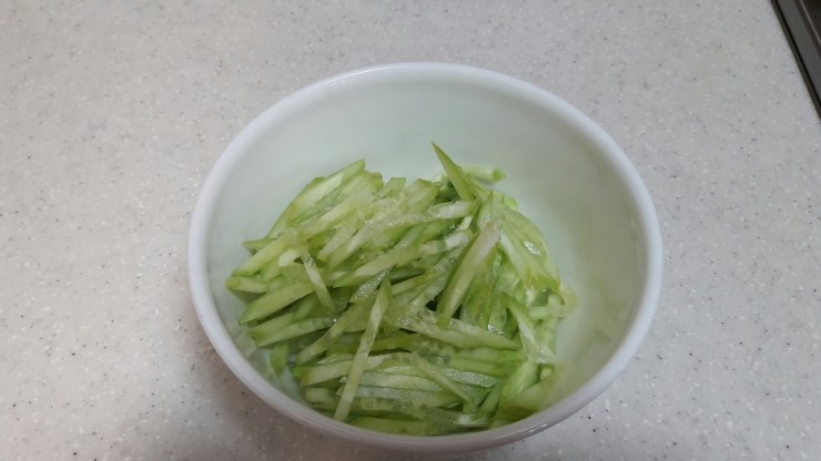 재료:오이 작은 거 두 개, 양파 1/4개, 크래미맛살, 소금 약간