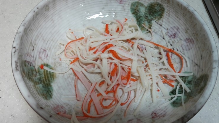 2. 오이가 절여지는 동안 크래미 맛살을 먹기 좋게 찢어놓고~