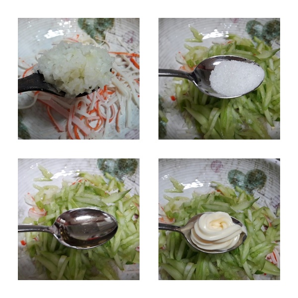 4. 소금으로 절여진 오이의 물기를 짜내고, 양파와 크래미맛살을 섞어 설탕 반스푼을 넣습니다.