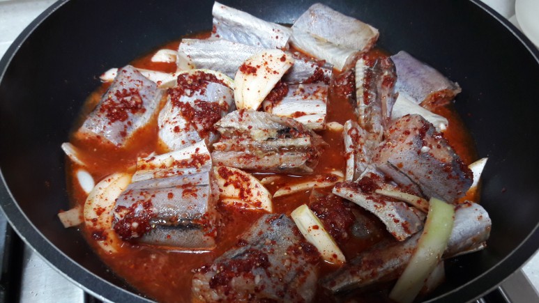 1. 물기를 빼놓은 코다리와 채 썬 양파를 프라이팬에 깔고 물 2컵과 양념장을 넣습니다.