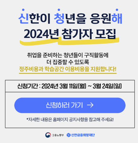 다양한 기업에서 청년들을 응원하고 지원하는 사업들이 시행중입니다. 내가 받을 수 있는지 자격조건을 확인하시고 해당되시는 분들은 꼭 지원하셔서 지원금 받으시기 바랍니다. 신한 금융 희망재단과 고용노동부가 취업을 준비하는 청년들의 비용 부담을 덜어주고 구직활동에 조금 더 집중할 수 있도록 청년지원사업을 진행합니다. 자세한 내용 알아보았습니다.