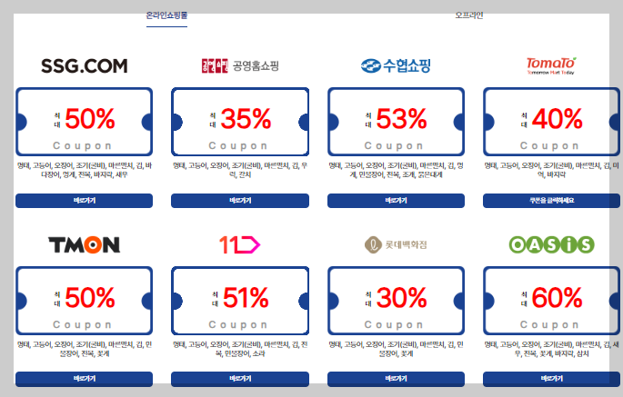 이번 행사에는 이마트, 홈플러스, 롯데마트, 농협하나로마트, 수협바다마트, GS리테일 등 오프라인 14개 업체와 우체국 쇼핑, 쿠팡, 마켓컬리, 수협쇼핑 등 25개 온라인 쇼핑몰이 참여합니다. 해수부가 1인당 1만원 한도로 20% 할인을 지원하고 참여 업체에 자체 할인을 더하면 소비자들은 최대 50%까지 할인된 가격으로 수산물을 구매할 수 있다고 합니다.