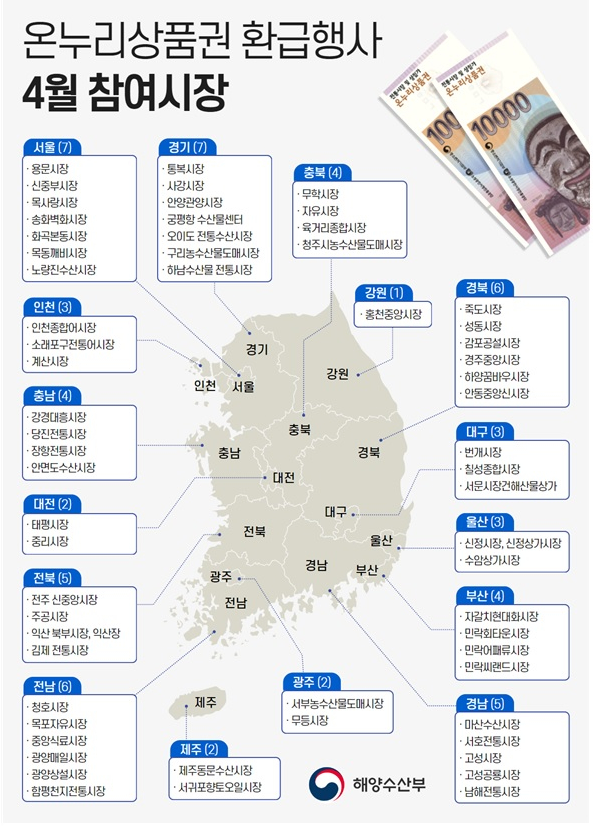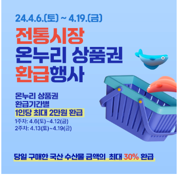 특히 4월 6일부터 19일까지 전국 64개 전통시장에서 '4월 온누리상품권 환급행사'가 진행됩니다. 소비자는 영수증과 신분증으로 행사장에서 국산 수산물을 구매하면 간단한 본인확인을 거쳐 국내산 수산물 구매금액에 따라 최대 2만 원까지 온누리상품권을 환불받을 수 있습니다.