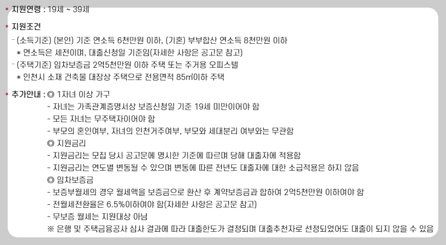 인천시에 거주하는 19세~39세 이하 무주택 청년 세대주가 대상인데, 등본상 주소가 인천으로 되어있어야 하며 인천시로 전입예정인 분들도 포함됩니다. 신청기간은 24년 4월 2일 화요일 9:00시부터 24년 6월 28일 금요일 18:00시까지입니다. 6월까지 갈 것도 없이 금방 마감될 것 같습니다.