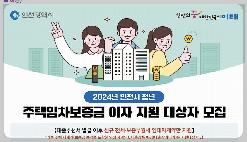 인천시가 무주택 청년들을 위한 주택임차보증금 이자 지원사업을 실시하고 있습니다. 지원인원이 제한되어 있으니 얼른 서두르셔서 혜택 받으시기 바랍니다. 지원대상과 지원내용, 지원자격등에 대해 알아보았습니다.