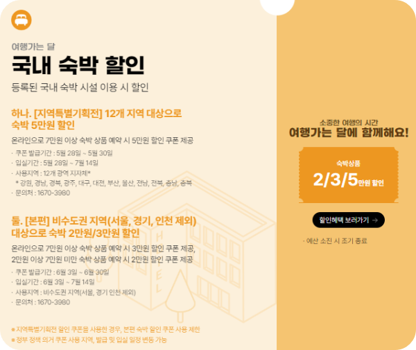 - 비수도권 지역(서울, 경기, 인천 제외) 대상으로 온라인으로 7만 원 이상 숙박 상품예약 시 3만 원, 2만 원 이상 7만 원 미만 예약 시 2만 원의 할인 쿠폰이 제공