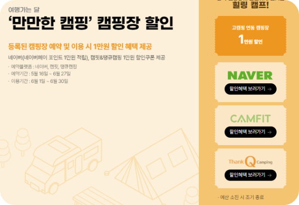 - 등록된 캠핑장 예약 및 이용 시 1만 원 할인 혜택 제공