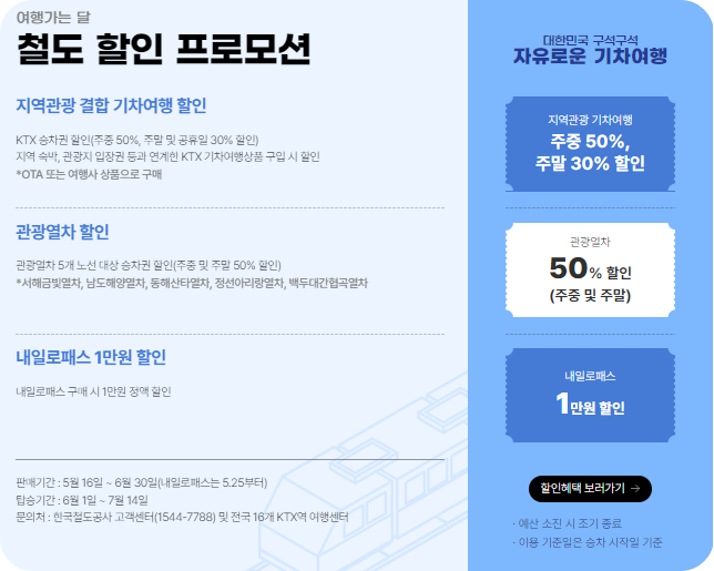 - 관광열차 5개 노선의 승차권(서해금빛열차, 남도 해양열차, 동해산타열차, 정선아리랑열차, 백두대간 협곡열차)을 50% 할인된 금액으로 구매가능