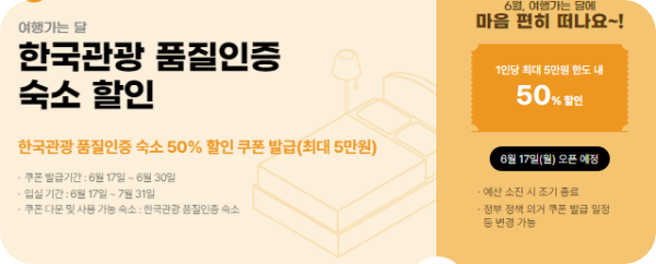 - 한국 관광 품질 인증 숙소 50% 할인 쿠폰 제공(1인당 최대 5만 원 한도)