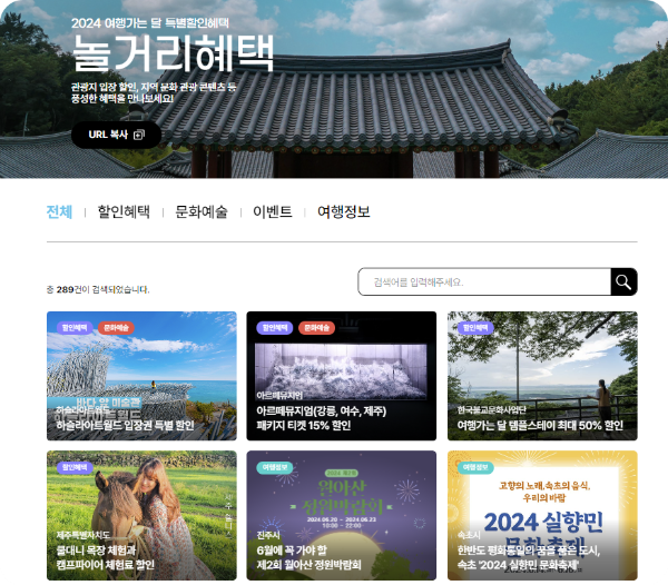그 외 아르떼 뮤지엄 패키지 티켓 15% 할인, 칠곡 양 뗏목장 입장권 할인 등 273건의 전국 관광지 입장권 할인 및 지역 문화 관광 콘텐츠 등의 혜택과 80개 내외의 국내 패키지여행 상품 최대 30% 할인, 농촌 여행상품 최대 50% 할인 등 여행상품 특별 할인전을 준비 중에 있으니 검색창에 '여행 가는 달'을 검색해서 홈페이지에 방문해서 자세한 내용 살펴보시고 혜택 받으시기 바랍니다.