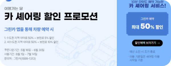 - 그린카 앱을 통해 차량을 예약할 시 최대 50% 할인