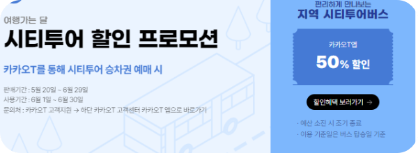 - 카카오 T를 통해 시티투어 승차권을 예매하면 50% 할인