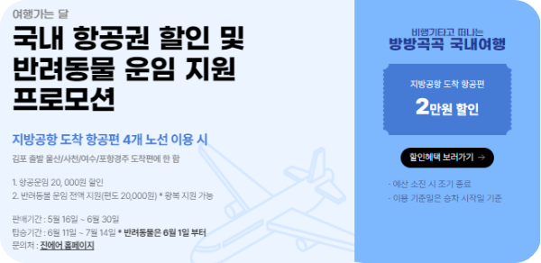 - 지방공항 도착 항공편 4개 노선 이용 시 항공운임 2만 원 할인, 반려동물 운임도 전액 지원