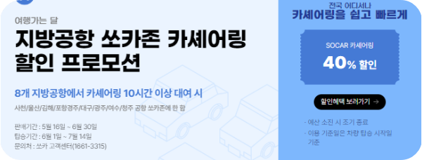 - 8개 지방공항 쏘카존에서 10시간 이상 대여 시 40% 할인이 되고,